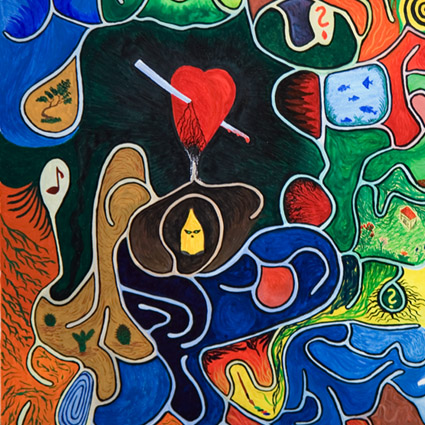 Ich habe meine Erinnerungen zusammengeschrieben und meinen Weg in dem Irrgarten der Erziehung, Medizin und Psychotherapien, habe begonnen diesen Irrgarten zu malen, da ist das Gefühl zu sehen, dass mein Herz durchbohrt würde, immer wenn der Blick meines Vaters mich traf, wenn ich nicht so war wie ich sein sollte .. .. mein kleiner Gnom, der in der Kindheit meinen Schlaf bewachte (bis meine Eltern mich zwangen ihn wegzuwerfen, weil ich schon zu groß für „so was“ war), die Fische, die mir nach langem Betteln als einzige Haustiere bewilligt wurden, Kakteen und Bonsai als Beschäftigung mit der pflanzlichen Natur, Malen als Hobby, mit dem ich mich wohlfühlte, und der Traum vom eigenen Haus mit Garten, von dem ich glaubte, dies würde mich glücklich machen, die Musik in Form von Klavierunterricht als Sackgasse, und ein paar ungelöste Fragen .... Ich konnte dieses Bild nicht fertigstellen, der Teil mit dem „Ausgang“ wollte nicht gelingen.